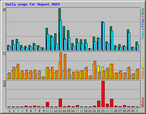 | Day | Hits | Files | Pages | Visits | Sites | KBytes | ||||||
